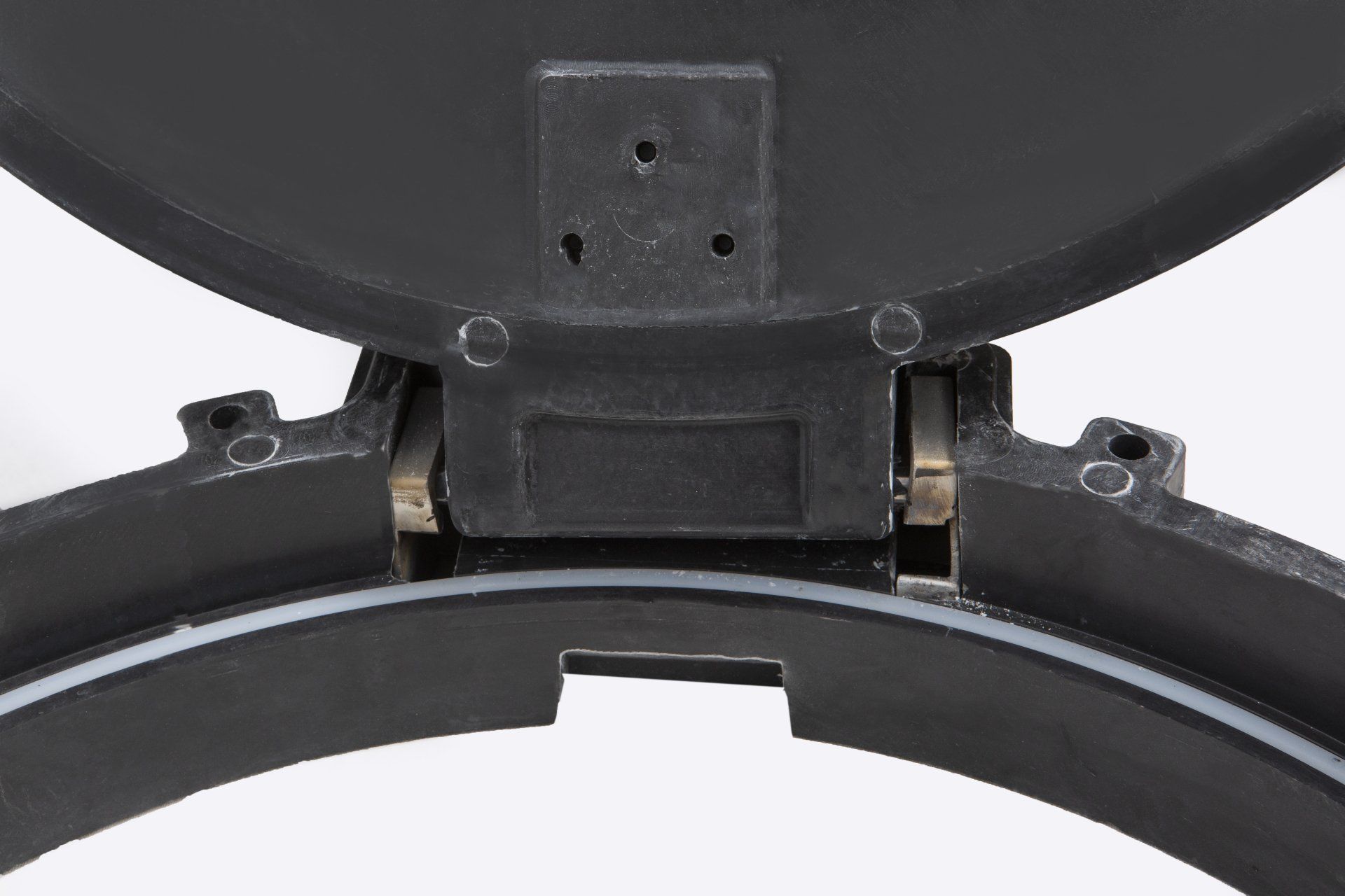 El juego de registro fabricado en material compuesto (composite) DN600-D400, resistente a todo tipo de fluidos y materias agresivas, está equipado con un sistema de bisagra y permite que la tapa quede abierta a 120º sin peligro que se puede cerrar sola por cualquier incidencia según norma EN124.